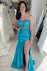 Rhinestone Strapless Mermaid Long Formal Dress with Slit - Teal