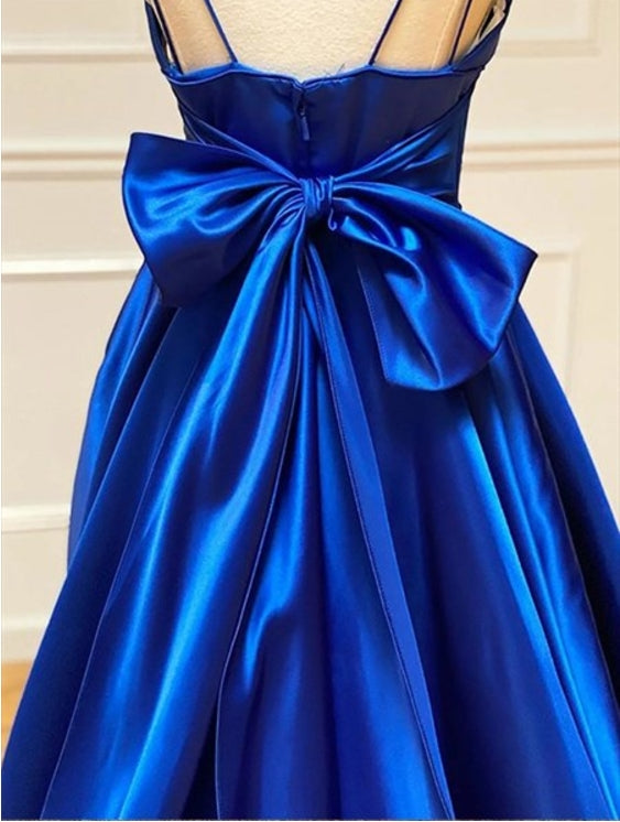 Royal Blue A-Line Satin Bowknot V-Neck Spaghetti Straps Prom Dresses