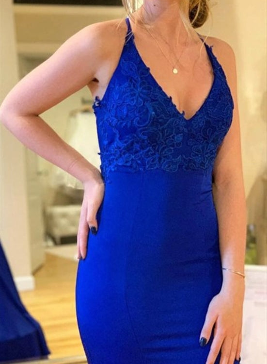 Royal Blue Mermaid V-Neck Lace Applique Criss-Cross Back Prom Dresses