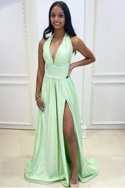 Sage Green Halter Long Boho Dress with Slit - US 2 / UK 6 / EU 32