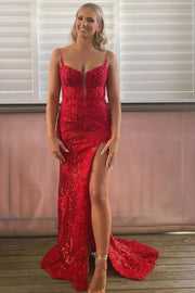 Sequin Split Neck Long Prom Dress with Slit - Red