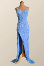 Straps Blue Sequin Ruched Faux Wrap Prom Dress