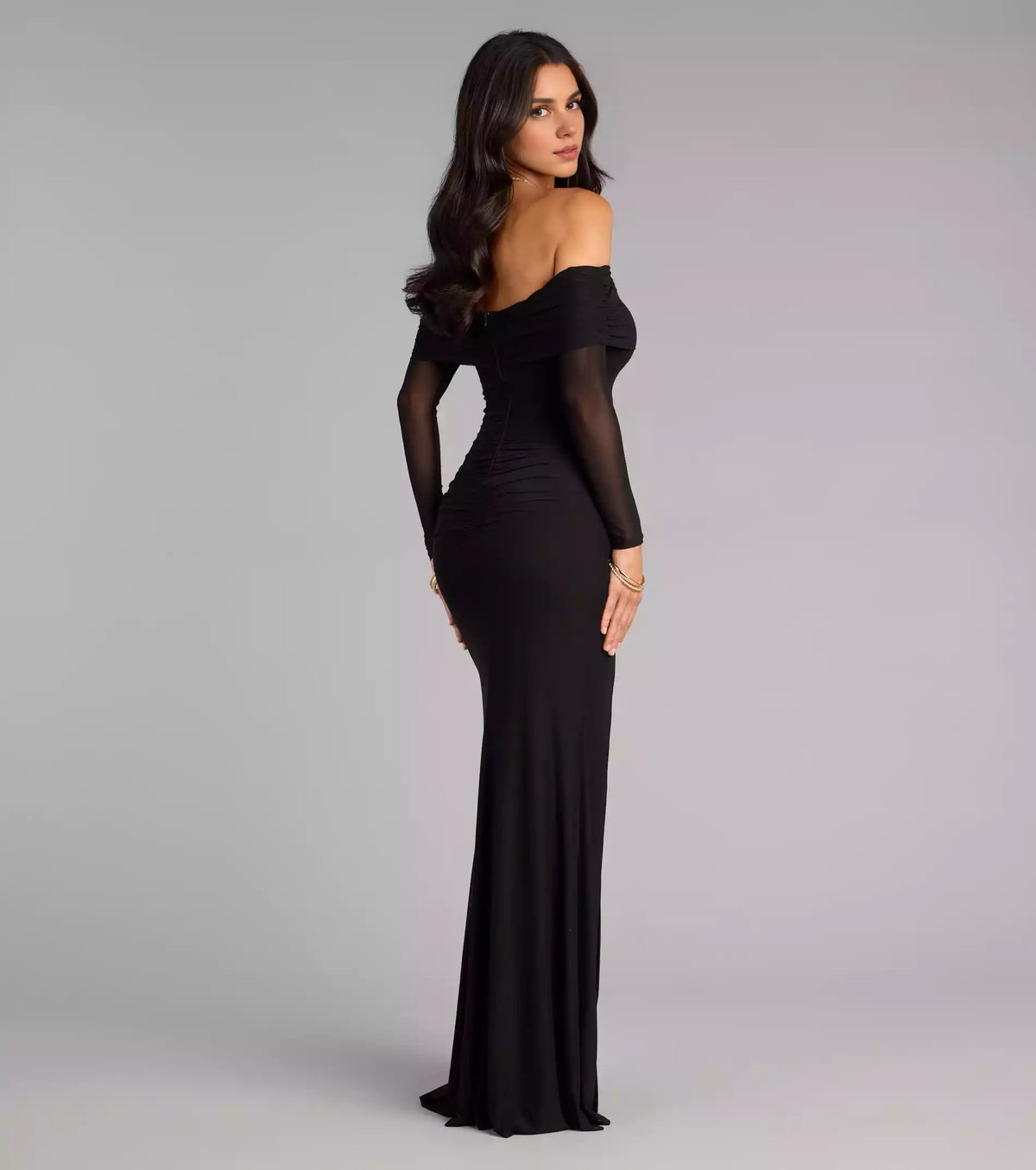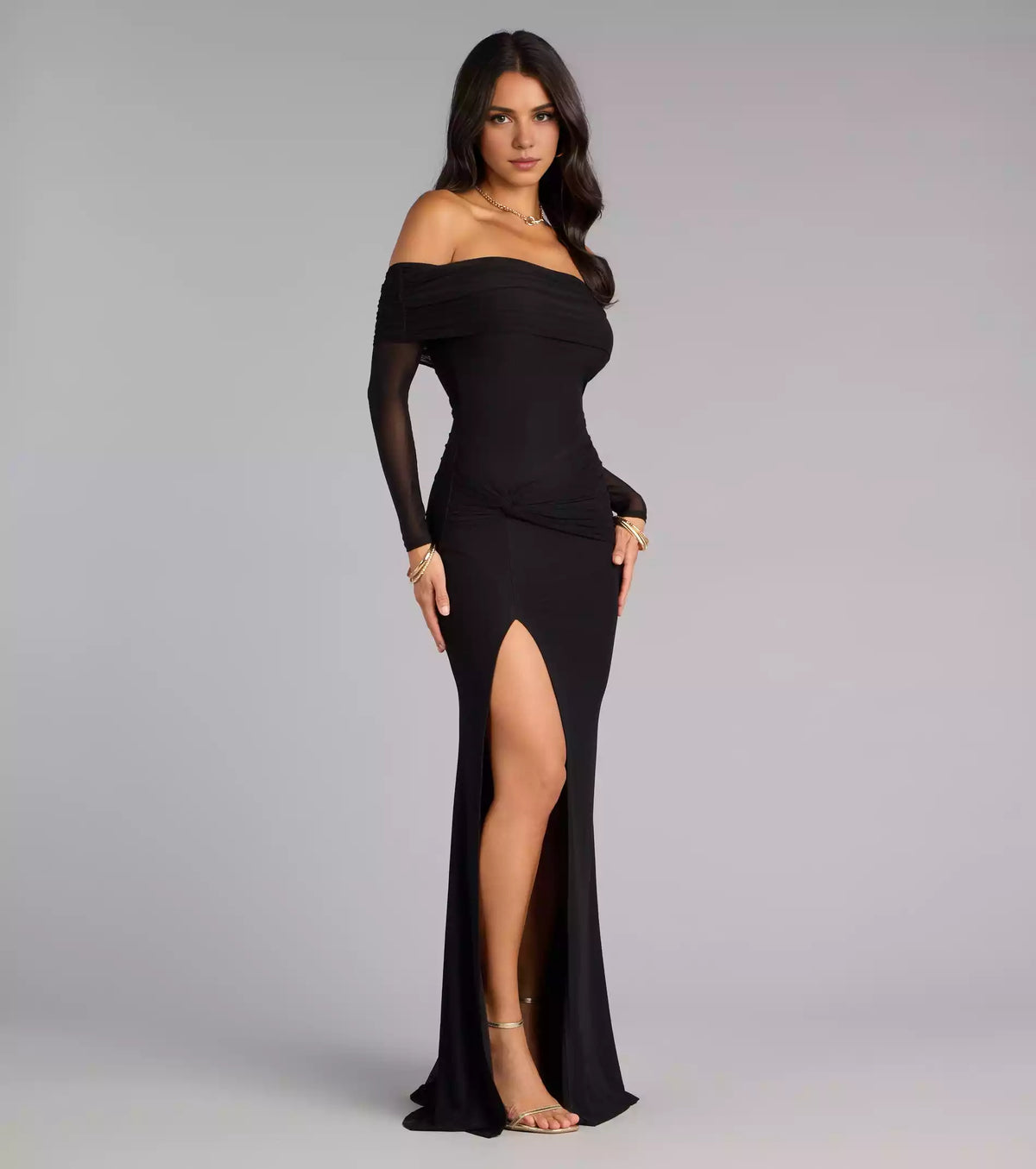 Stunning mesh knit lining with off shoulder neckline, slim fit long sleeves, high slit mermaid silhouette, and floor skirt Prom Dresses - US 2 / UK 6 / EU 32