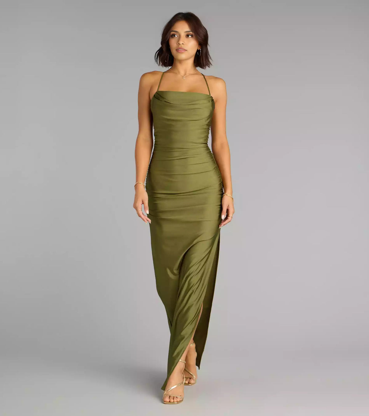 Stunning stretch knit scarf collar with thin shoulder straps, back straps, side seams, pleats, and floor Prom Dresses - US 2 / UK 6 / EU 32
