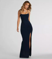 Sweet and smooth knit elastic adjustable thin shoulder straps cross back high slit mermaid silhouette and floor Prom Dresses - US 2 / UK 6 / EU 32