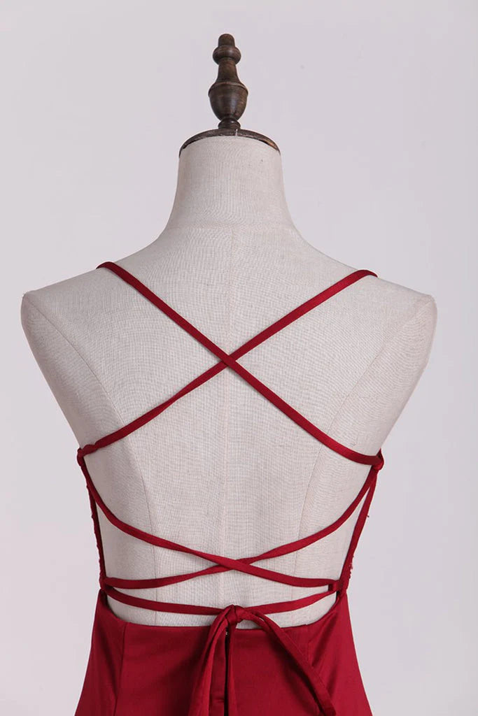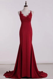 Trumpet/Mermaid Sleeveless Spaghetti Straps Sweep/Brush Train Spandex Prom Dresses - Burgundy