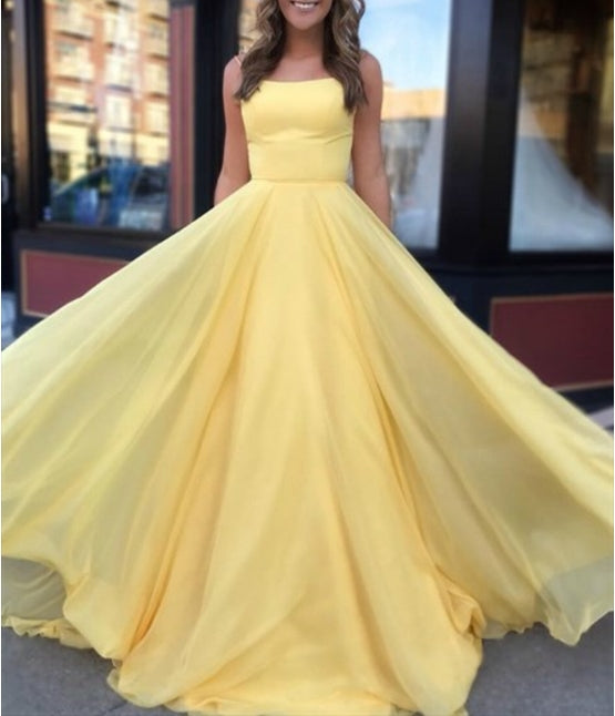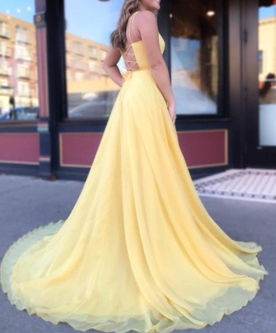 Yellow A-Line Chiffon Double Strap Prom Dress With Strappy Corset Back - US 2 / UK 6 / EU 32