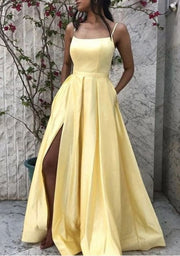 Yellow A-Line Satin Spaghetti Straps Sleeveless Long Prom Dresses