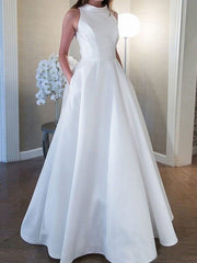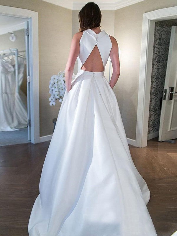 A-Line/Princess Satin Ruffles High Neck Sleeveless Sweep/Brush Train Wedding Dresses