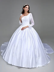 Ball Gown Wedding Dresses Scoop Neck Satin Long Sleeve Simple Vintage See-Through with Beading Appliques