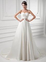 DingjiA-Line Wedding Dresses Sweetheart Neckline Court Train Satin Strapless with Buttons Ruched Beading