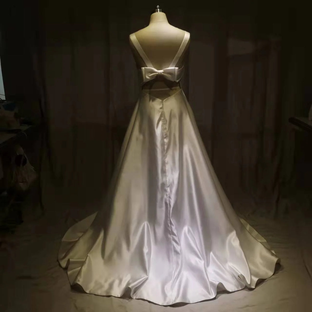 Elegant A Line V Neck Ivory Wedding Dresses With Pockets Open Back Satin Bowknot Wedding Gowns