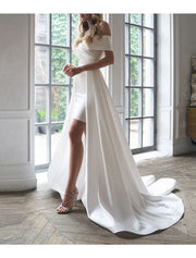 Little White Dresses Wedding Dresses Two Piece Off Shoulder Short Sleeve Sweep / Brush Train Satin Bridal Suits Bridal Gowns With Ruched