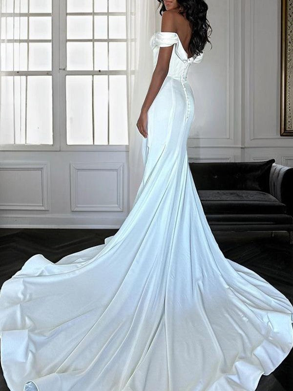 Sheath/Column Elastic Woven Satin Ruched Off-the-Shoulder Sleeveless Cathedral Train Corset Wedding Dresses - US 2 / UK 6 / EU 32