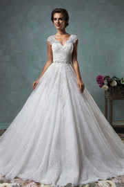 A-Line Applique Wedding Dress Cap Sleeve Court Train Princess Dress