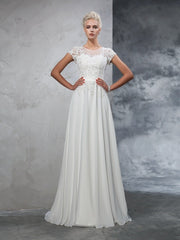 A-Line/Princess Sheer Neck Applique Short Sleeves Long Chiffon Wedding Dresses