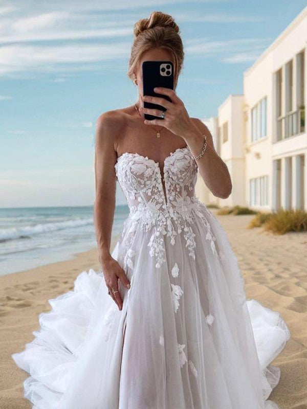 A-Line/Princess Tulle Applique Off-the-Shoulder Long Sleeves Court Train Corset Wedding Dresses