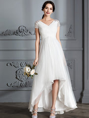 A-Line/Princess V-neck Short Sleeves Asymmetrical Tulle Wedding Dresses - US 2 / UK 6 / EU 32