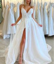 A Line V Neck Organza Long Wedding Dresses with Appliques
