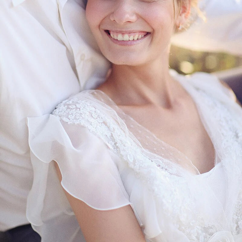 Dingji WeddingjiDress Elegant A-Line Ivory Flower Cap Sleeve V-Neck Chiffon Open Back Wedding Dresses