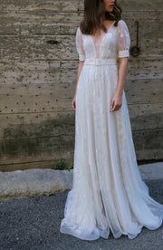 Ethereal Tulle Plunging Neck Half Sleeve Long Bridal Gown