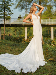 Sheath/Column Charmeuse Beading Scoop Sleeveless Sweep/Brush Train Wedding Dresses