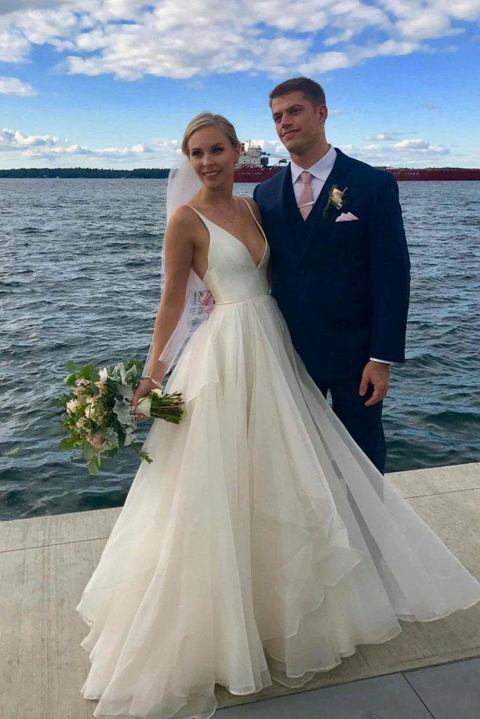 Simple V Neck Spaghetti Strap Backless Ivory A Line Cheap Beach Wedding Dresses