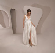 Simple Wedding Dress Pleated Skirt Wedding Gown V Neck Open Back Bridal Gown
