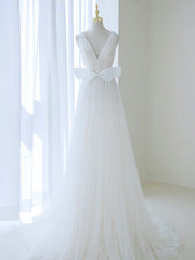 Simplicity A-Line V Neck White Tulle Long Wedding Dress with Bow
