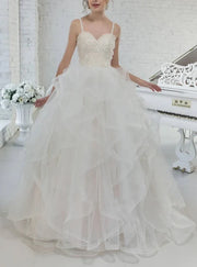 Tulle Ball Gown Ruffled Spaghetti-Straps Sleeveless Wedding Dress with Appliques - US 2 / UK 6 / EU 32