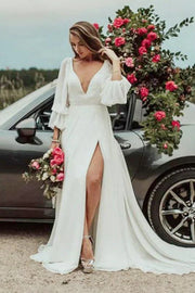 V Neck A Line Long Sleeves Wedding Dresses With Slit