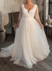 V-neck A Line Tulle Court Train Wedding Dress with Ruching