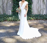 V-Neck Cap Sleeves Backless Wedding Dress with Ruffles