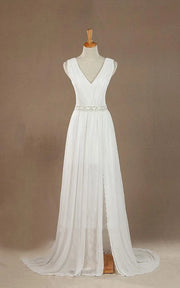 V-Neck Chiffon Beading High Slit Weddig Dress with Low-V Back