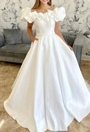 White Off-the-Shoulder Ruffle Long Bridal Gown