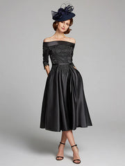 A-Line Mother of the Bride Dress Plus Size Sexy Off Shoulder Tea Length Satin Lace 3/4 Length Sleeve with Lace Sash / Ribbon