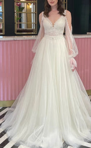 A Line Scalloped Tulle Sweep Train Wedding Dress with Appliques
