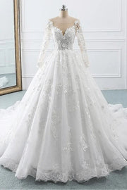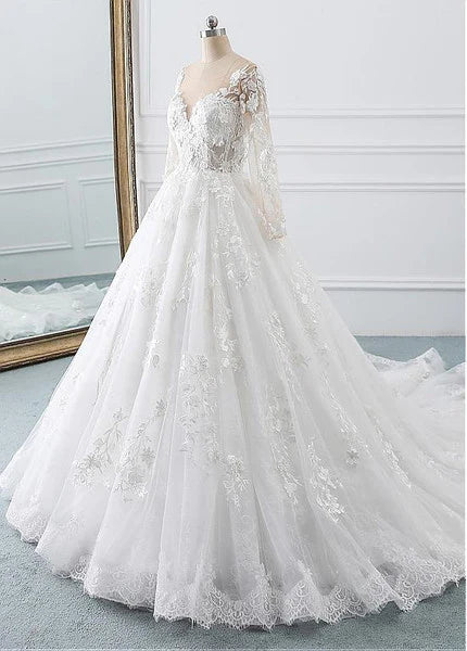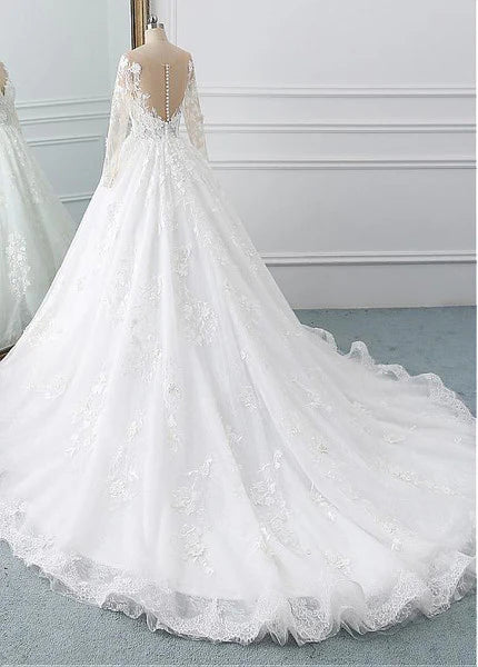 A Line Wedding Dresses Long Sleeves With Applique Tulle Covered Button Sweep Train