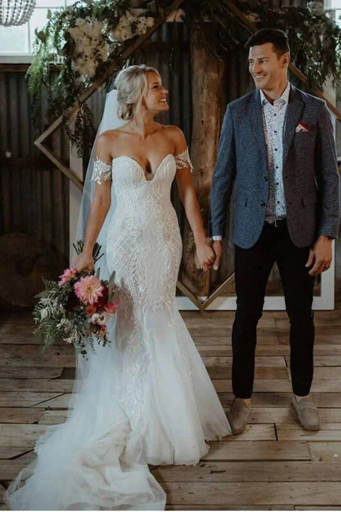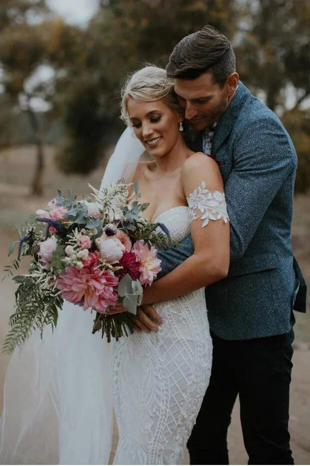 Charming Ivory V Neck Mermaid Strapless Lace Appliques Wedding Dresses
