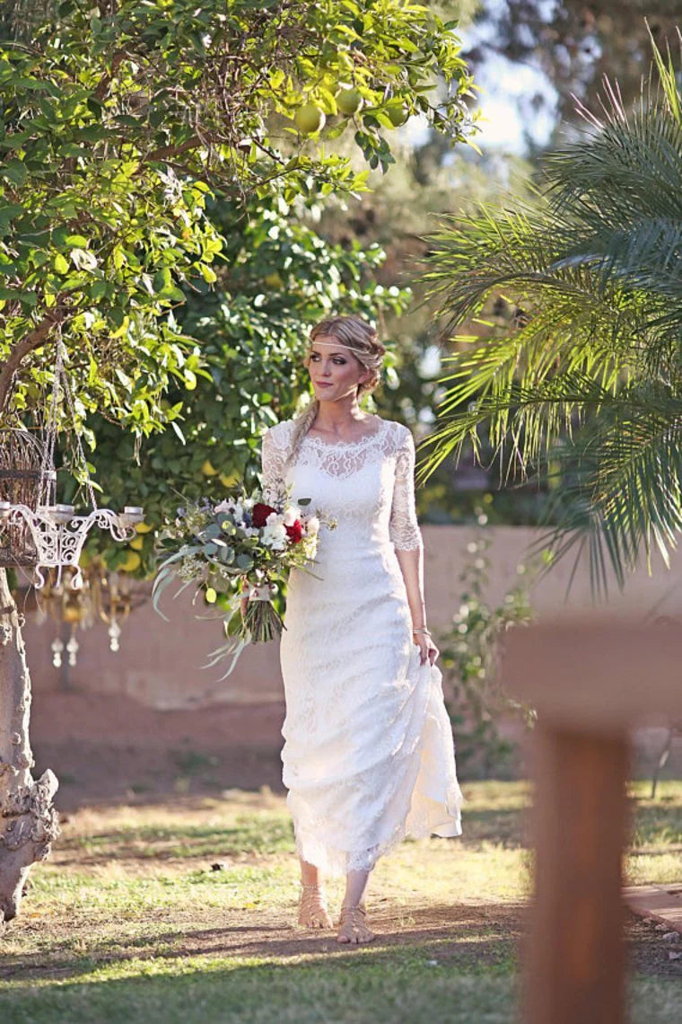 Dingji WeddingjiDress Mermaid Scoop Wedding Dresses 3/4 Length Sleeves Lace Open Back