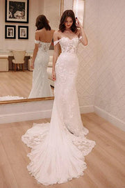 Sheath Off-the-Shoulder White Mermaid Chiffon Lace Appliques Beach Wedding Dresses