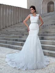 Trumpet/Mermaid V-neck Applique Sleeveless Long Lace Wedding Dresses